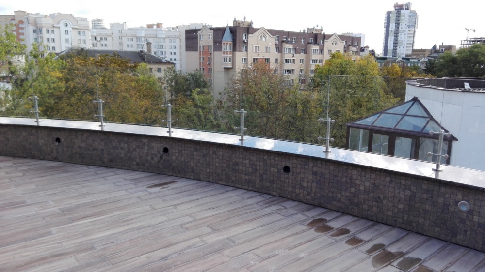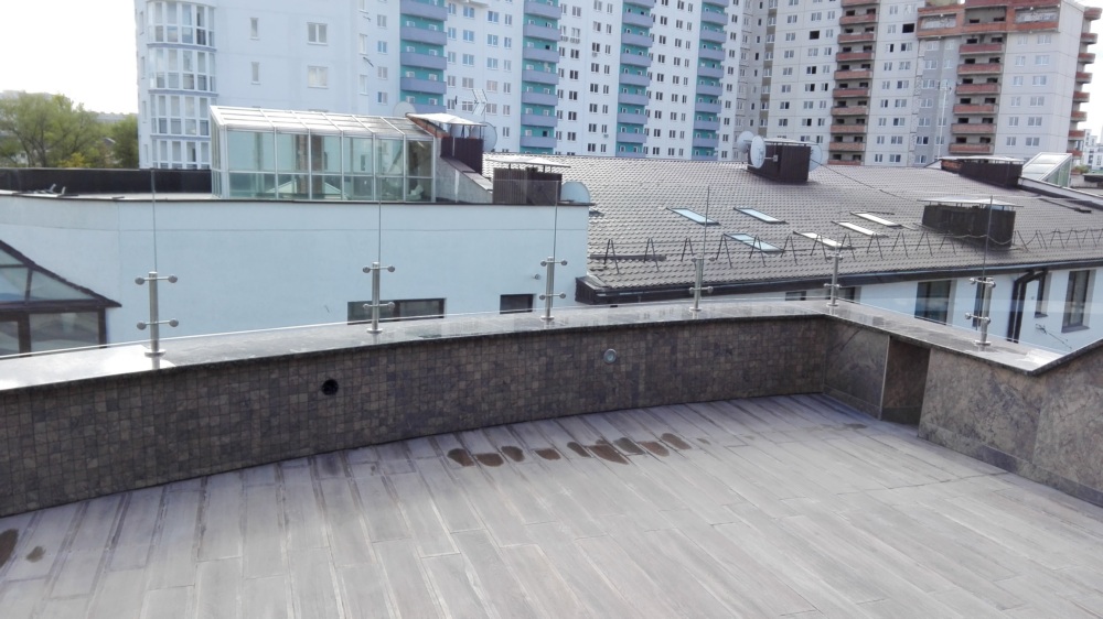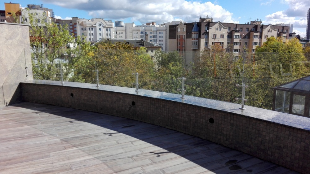 Выполнены работы по изготовлению и монтажу стеклянного ограждения террасы в Минске. Открытая площадка террасы находится по улице Грибоедова, на одном из последних этажей жилого дома. На том же объекте, в 2018 году, был изготовлен и установлен нестандартный стеклянный навес.
