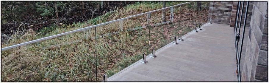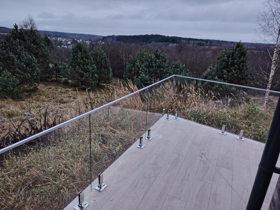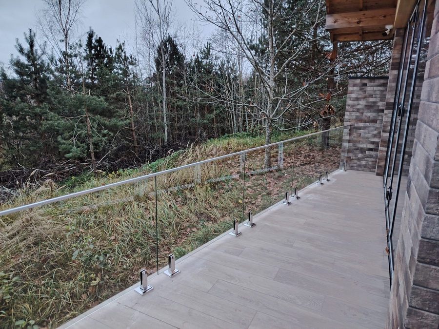 Стеклянное ограждение террасы в г. Витебске. Панели выполнены из прозрачного закаленного стекла толщиной 10 мм. Крепление производилось на квадратные стойки из нержавеющей стали.